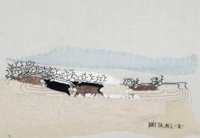 An assemblage of torn fabric strips from the bed sheets of Marie Lieb. Little is known of this woman, who created this startling display on the floor of a psychiatric ward where she was interned in 1894. The two installations are on two different floors, possibly public spaces in the hospital as they are larger than an individual room for someone interned. they include gradations of fabric sizes from strips to thread and include writing.