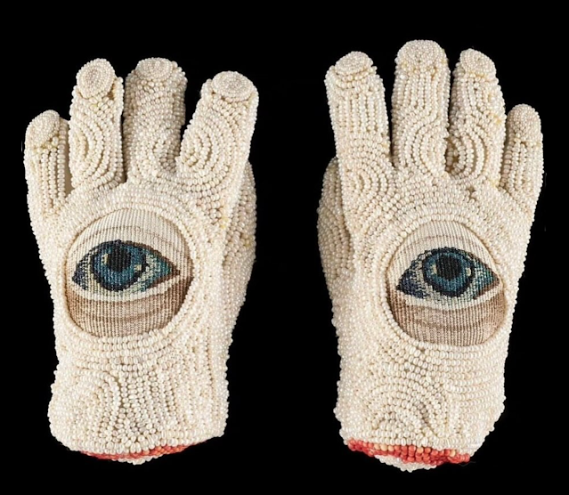 Hands of the Oracle (Couched fresh-water pearls, coral beads) by tapestry artist Jon Eric Riis.